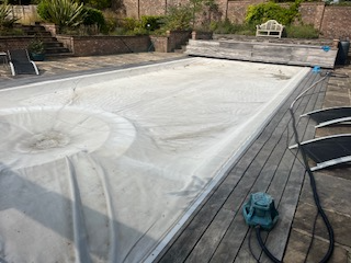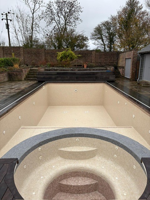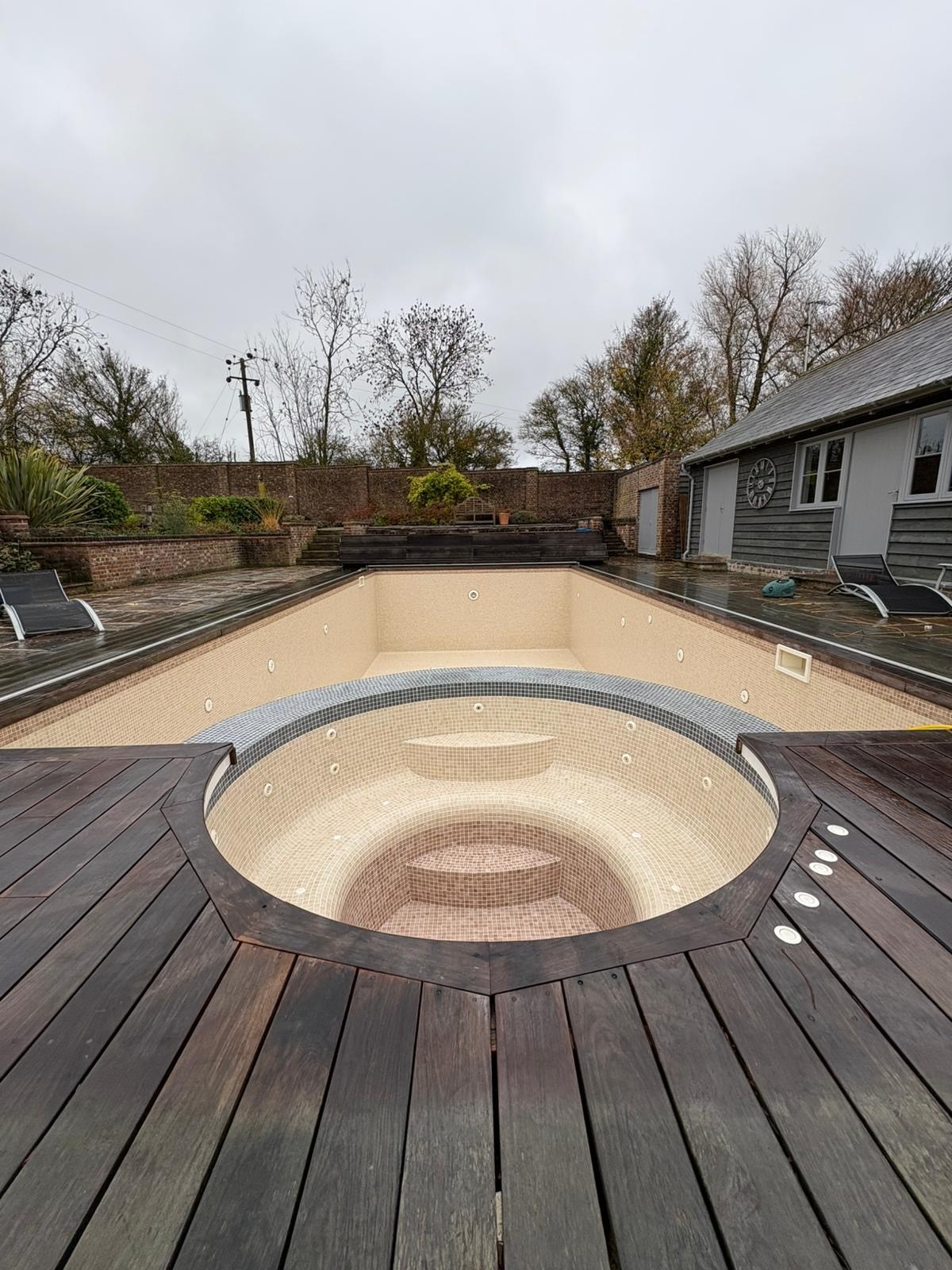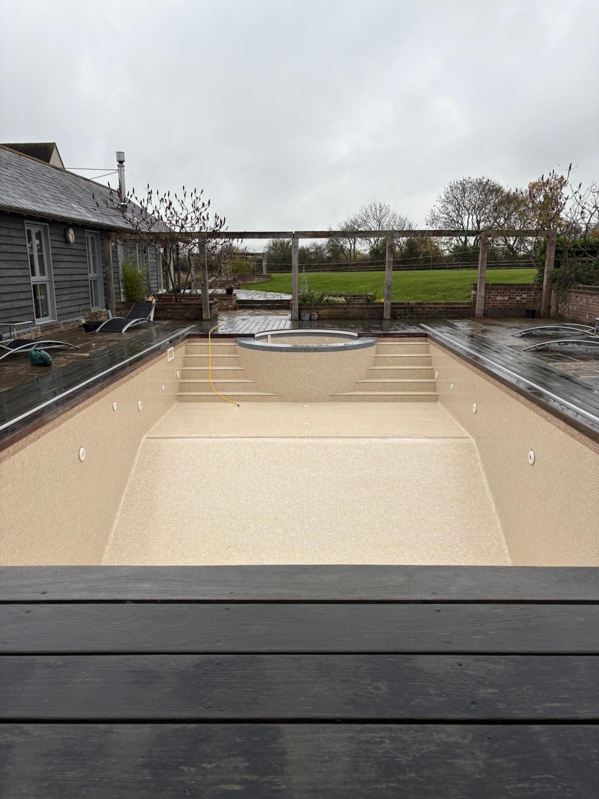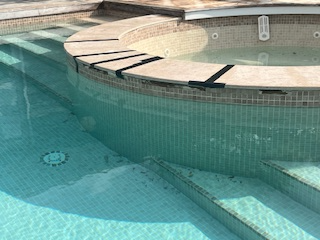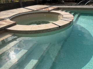 For this project, we removed the natural stone copings between the pool and the spa due to structural failure and displacement caused by the pool cover. The loose stone posed both aesthetic and safety concerns. We repaired and refinished the adjoining walls and top surfaces, ensuring a clean and durable foundation. To enhance visual contrast and modernize the space, we retiled the area using Harmonie Grey and Graphite mosaic tiles, creating a sleek, cohesive look that complements the surrounding design.