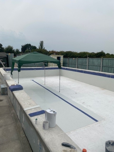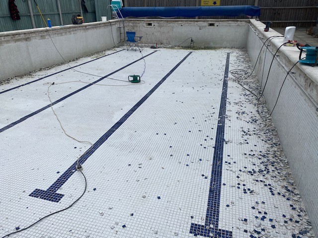 Works included full tile removal and re-tiling to closely match existing finishes, lifting and re-bedding copings, wall rendering, and painting of external walls.
